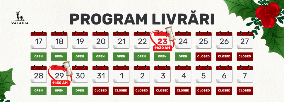 🎄De Crăciun, comenzile trebuie plasate până cel târziu marți, 23 decembrie, ora 11.30AM. Recomandăm plasarea comenzii cu 2-3 zile înainte de acest termen.