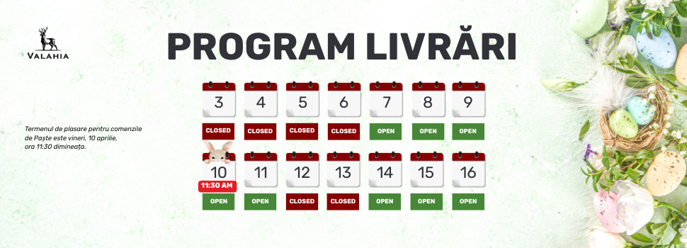 • Comenzile pentru Paște pot fi plasate până cel târziu vineri, 10 aprilie, ora 11:30.